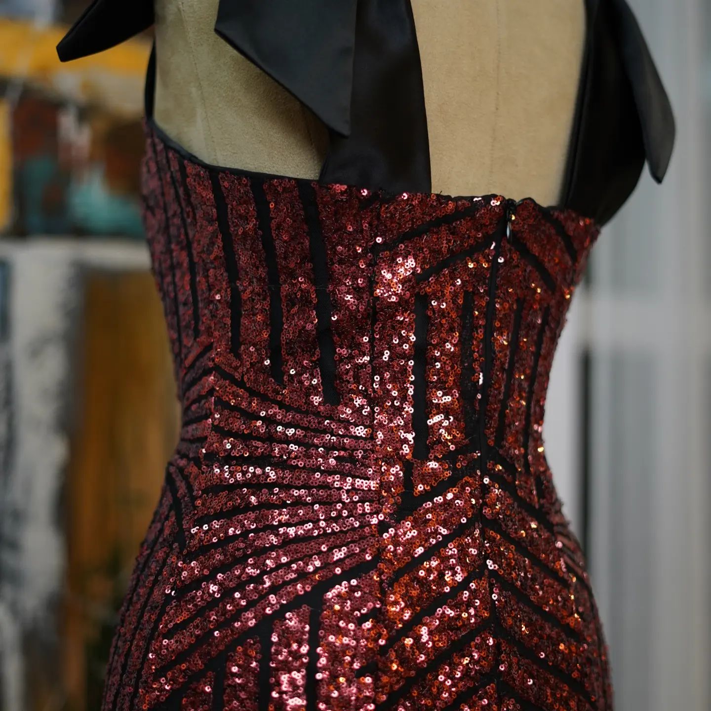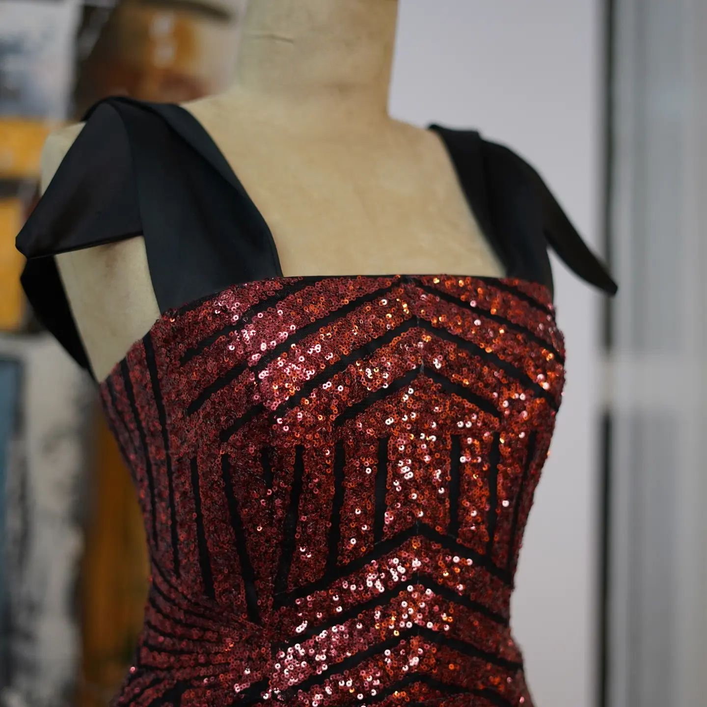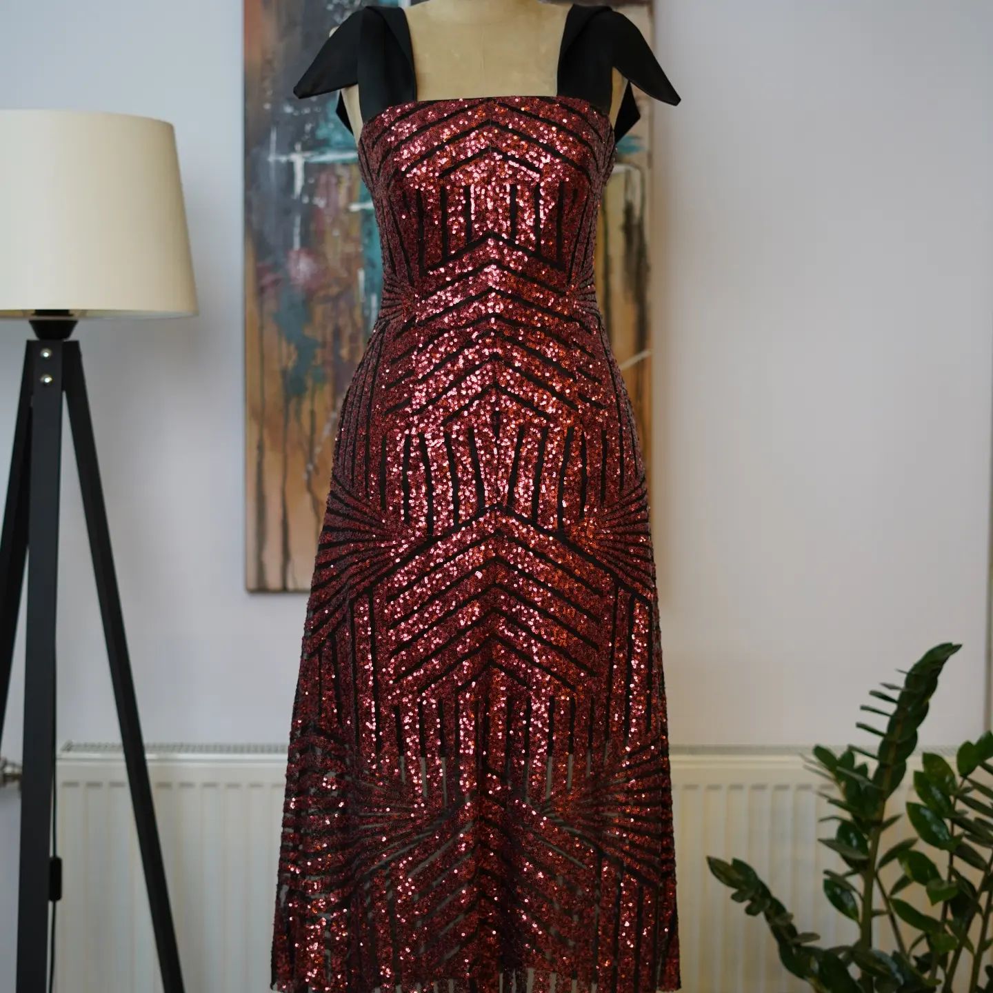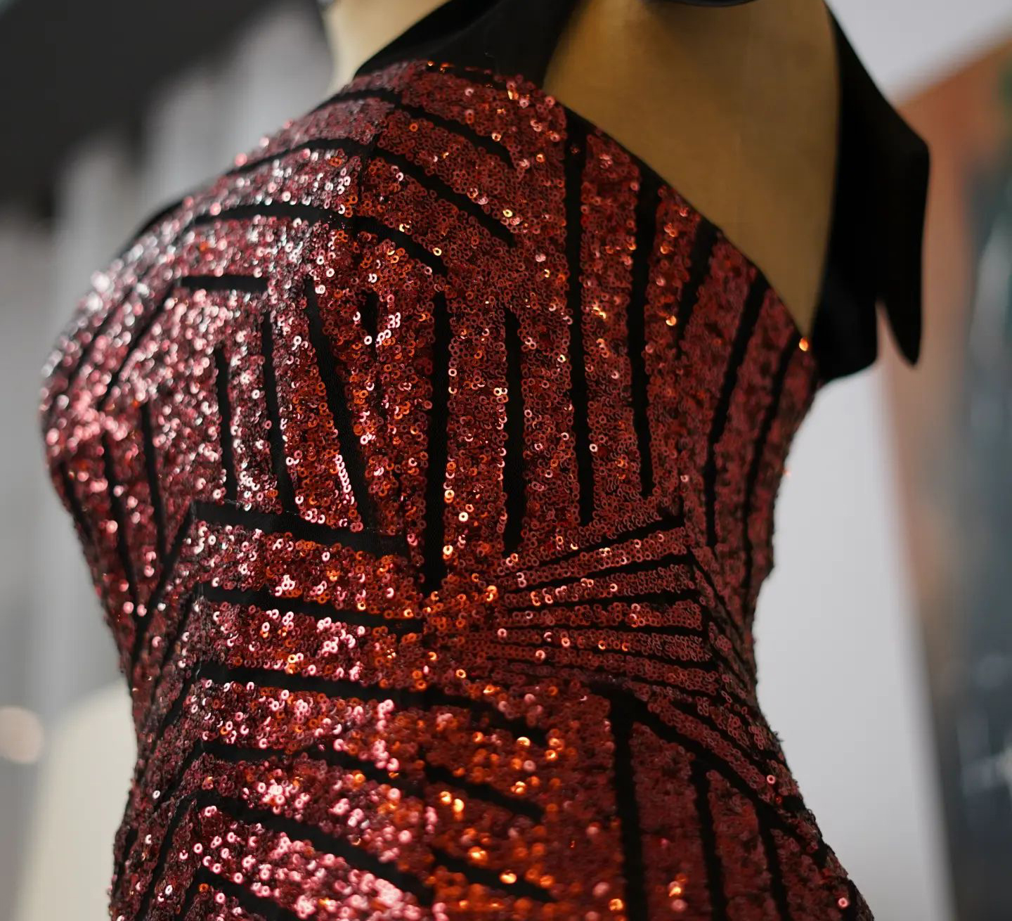 of sophistication and glamour. This exquisite dress is adorned with intricate red sequin patterns that